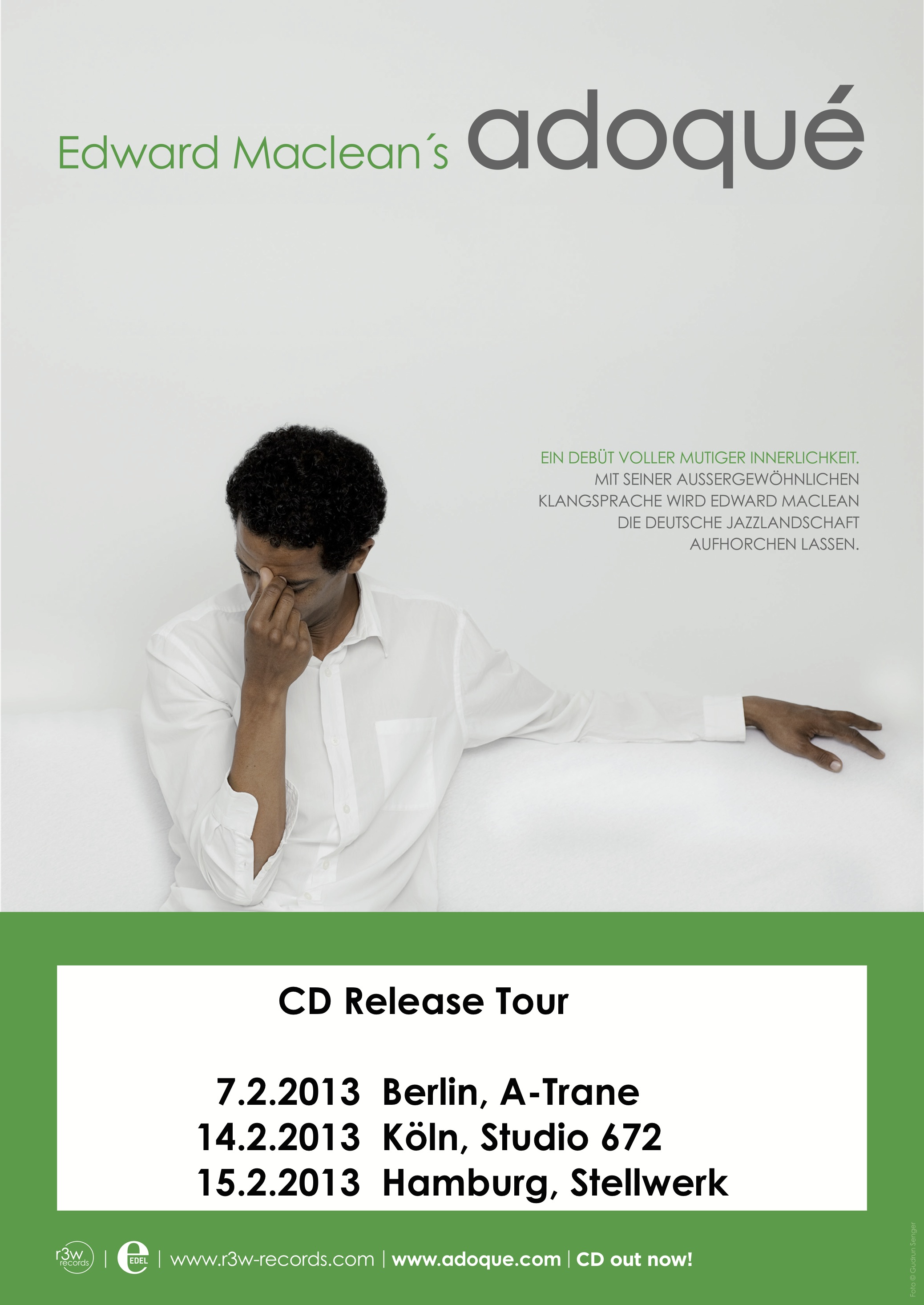 Edward Maclean’s Adoqué on Tour19. Januar 2013|In Musik|By Edward endlich geht es los, live on stage: 7.2. Berlin, A-Trane 14.2. Köln, Studio 672 15.2. Hamburg, Stellwerk CD erhältlich bei iTunes oder buecher.de